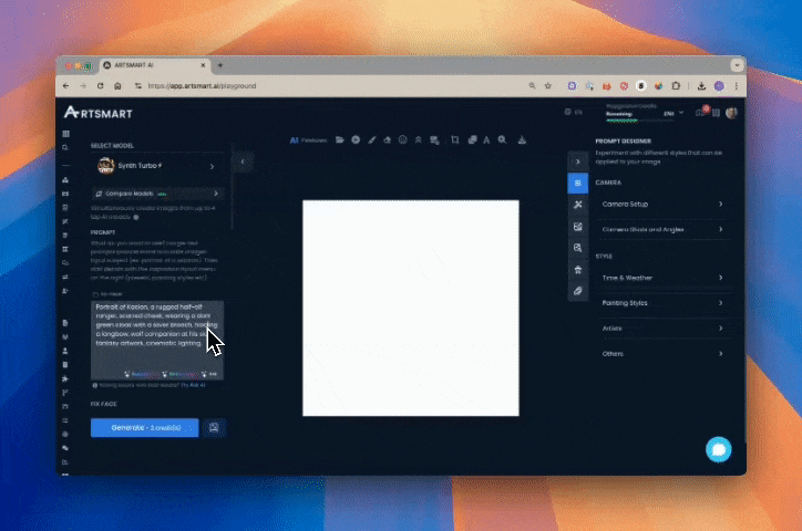 - ArtSmart: Easiest option for beginners. You simply select “Playground,” choose aspect ratio, and tweak details. Play around with prompts and ArtSmart Models, recommended using “Synth Turbo” or “Synth Pro” model. If you have a reference image, you can also try ArtSmart’s Image to Image feature.